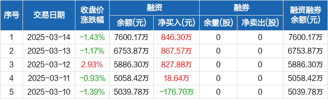 融资方面,当日融资买入1955.08万元,融资偿还1108.78万元,融资净买入846.3万元,连续4日净买入累计2560.39万元。融券方面,融券卖出0股,融券偿还0股,融券余量0股,融券余额0元。融资融券余额合计7600.17万元。