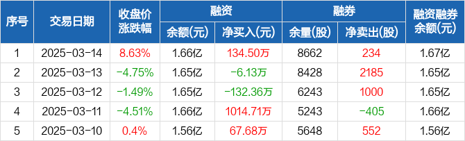 天承科技融资融券信息显示,2025年3月14日融资净买入134.5万元;融资余额1.66亿元,较前一日增加0.82%。