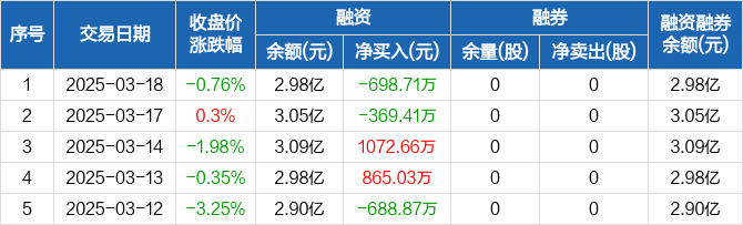 融资方面,当日融资买入2428.35万元,融资偿还3127.06万元,融资净偿还698.71万元。融券方面,融券卖出0股,融券偿还0股,融券余量0股,融券余额0元。融资融券余额合计2.98亿元。