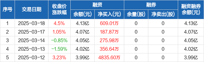 广大特材融资融券信息显示,2025年3月18日融资净买入609.01万元;融资余额4.13亿元,创历史新高,较前一日增加1.5%。