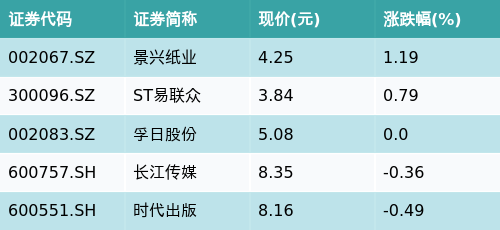 截至收盘,托育服务主题涨跌幅最高的五只股票为:景兴纸业(002067.SZ)、ST易联众(300096.SZ)、孚日股份(002083.SZ)、长江传媒(600757.SH)与时代出版(600551.SH)。详情见下表: