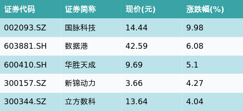 截至收盘,云计算主题涨跌幅最高的五只股票为:国脉科技(002093.SZ)、数据港(603881.SH)、华胜天成(600410.SH)、新锦动力(300157.SZ)与立方数科(300344.SZ)。详情见下表: