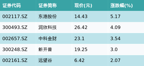 截至收盘,移动支付主题涨跌幅最高的五只股票为:东港股份(002117.SZ)、润欣科技(300493.SZ)、中科金财(002657.SZ)、新开普(300248.SZ)与远望谷(002161.SZ)。详情见下表: